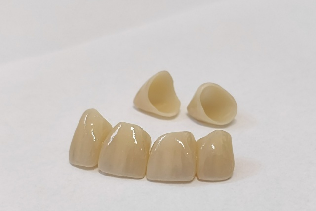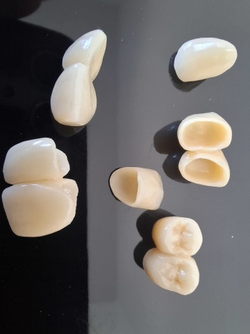 Konstrukce pro fasetování vyrábíme z laserem sintrovaného CoCr ve frézovacím centru. Pro fasetování používáme kompozit SIGNUM a keramiku IVOCLAR, VITA. Fasetované korunky jsou sice na ústupu, přesto je stále nabízíme.